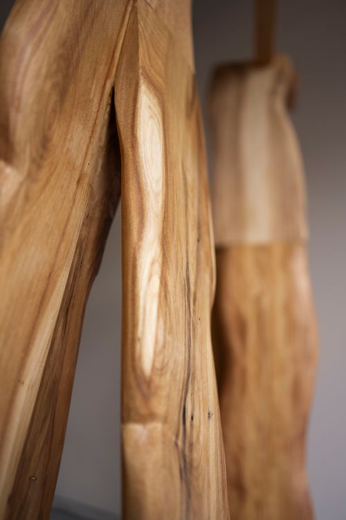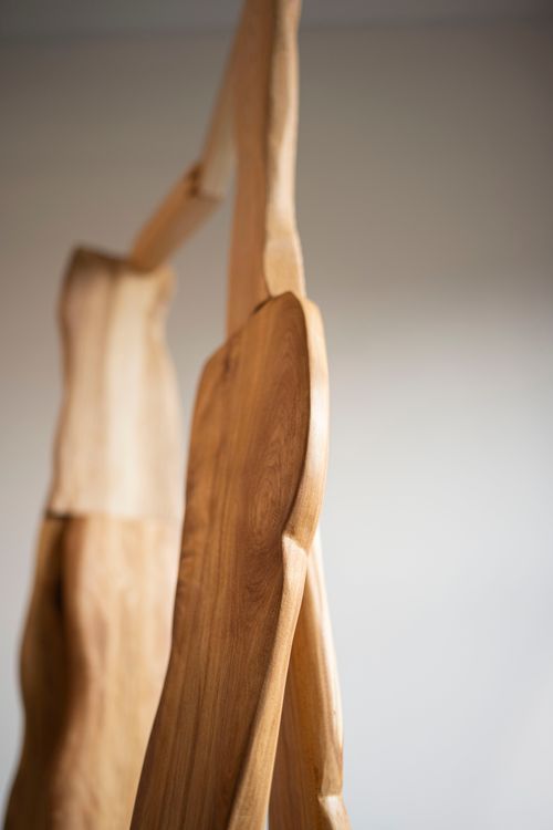 Everyone is in a state of continuous change. This clothes rack is inspired by feelings of friendship and aims to express the process of moving from strangers to friends. When you look at the piece from the side, you can clearly see two people standing apart. As guests hang their clothes on the rack, it begins to resemble a group of people standing together, the gap between the figures is closed. This process is not only a physical closing of the gap, but also a journey of the heart. It is made of three different kinds of wood, birch, beech and oak. Each of the two ‘figures’ holding up the rack are made of a different wood, showing a relationship between two people. Here, different wood species, with their unique colors and textures, shape the character of these two figures. Their postures depict them holding hands, while one extends an inviting hand, welcoming another to join. This gesture symbolizes an open invitation to you, encouraging a sense of intimacy and connection. Through its form, this clothes rack becomes more than just a functional object—it embodies a quiet, gentle presence, like a friend in your space. As people begin placing clothes on it, the piece gradually comes to life. With garments from yourself and others, interacting with the clothes rack turns into a playful experience. Deciding where to hang a coat or place a bag becomes an engaging process, making the act of using it feel like a creative game. I hope this piece of furniture can remind people of the times they gather with friends and bring you a sense of company.